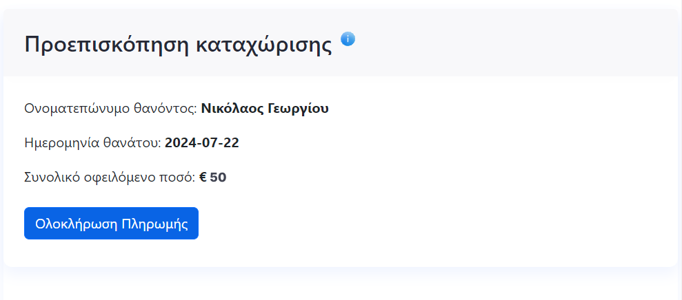 - Αυτή η σελίδα θα εμφανίζει μια επισκόπηση των στοιχείων καταχώρισης και πληρωμής της κηδείας