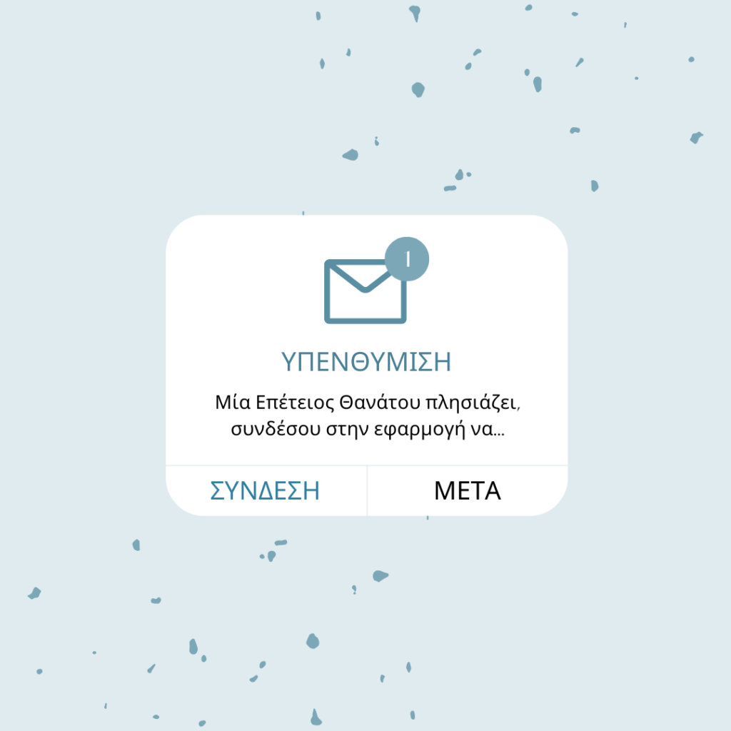 Επίσης, θα έρχεται αυτόματη ειδοποίηση και τα αντίστοιχα SMS και email πριν από κάθε επέτειο θανάτου, από κάθε κηδεία που έχετε βάλει στο σύστημα.